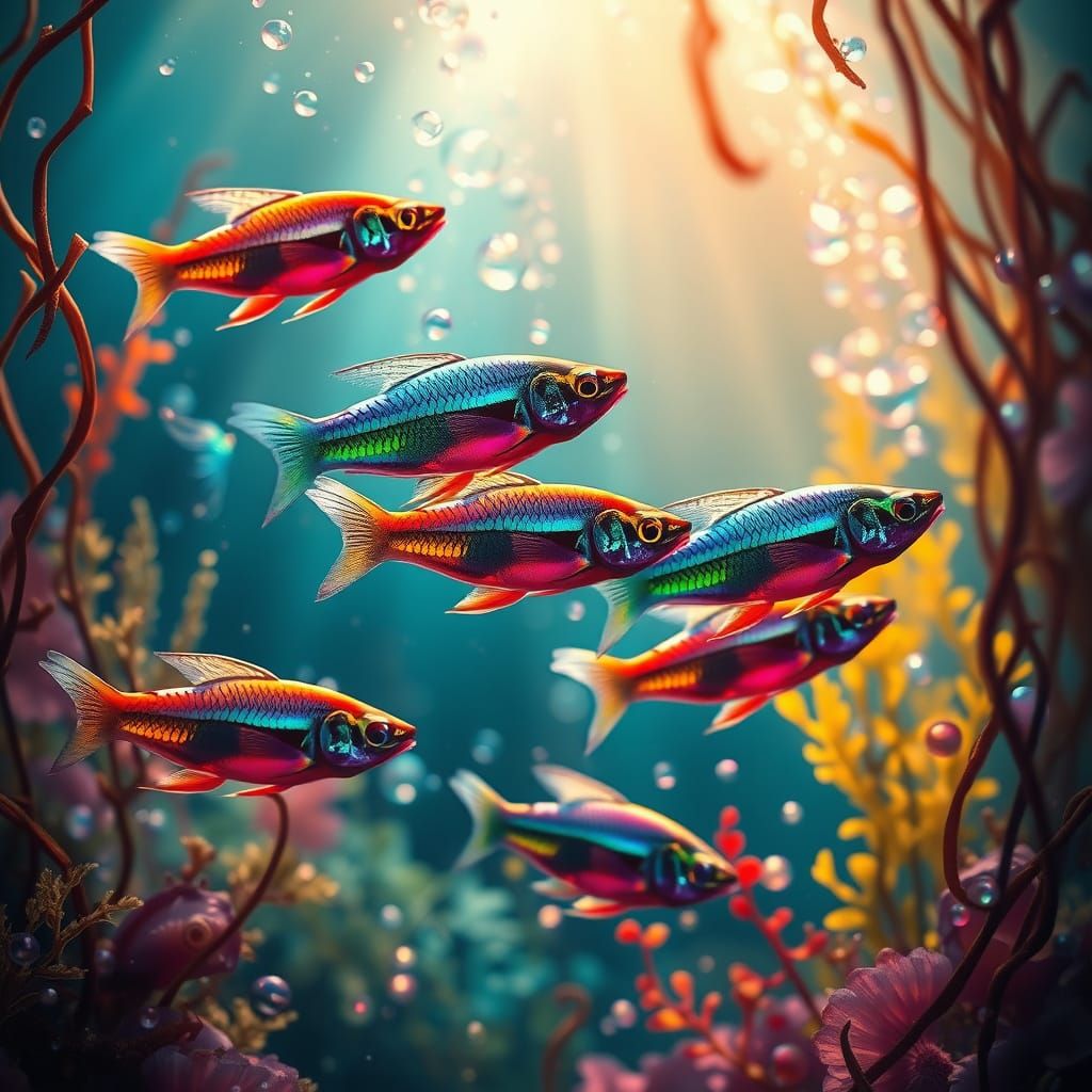 This vibrant image showcases a mesmerizing dance of neon tetra fishes, surrounded by undulating seaweed, sea plants, and glowing sea pearls, set against a backdrop of refracted sunlight and air bubbles, creating a dreamlike, ethereal atmosphere reminiscent of Syd Mead's concept art and Ash Thorp's aquati...