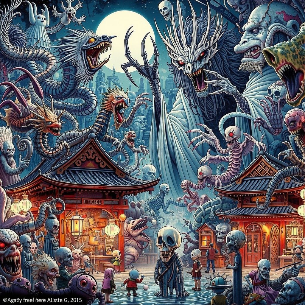 This image depicts a chaotic fusion of horror and martial arts film elements, featuring iconic characters causing destruction. The scene is rendered with dark neon, industrial, and atmospheric lighting.