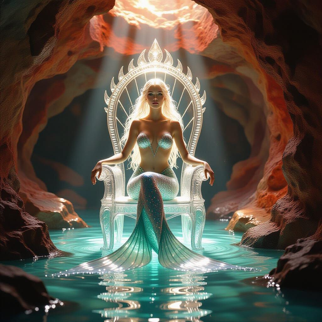 This hyperrealistic fantasy art depicts a translucent, sparkling glass mermaid on a throne in a cave. Ethereal lighting highlights shimmering textures and dramatic contrasts.