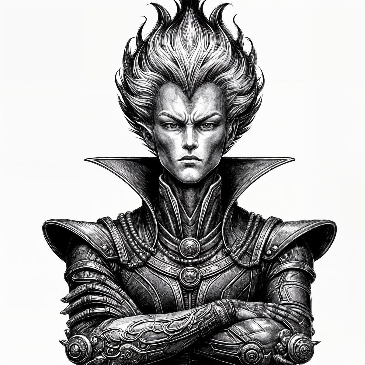 This image shows a confident, scowling alien with cybernetic enhancements. The figure stands with arms crossed, hair styled like a flame. The artwork is reminiscent of dark, classic Japanese manga illustration.