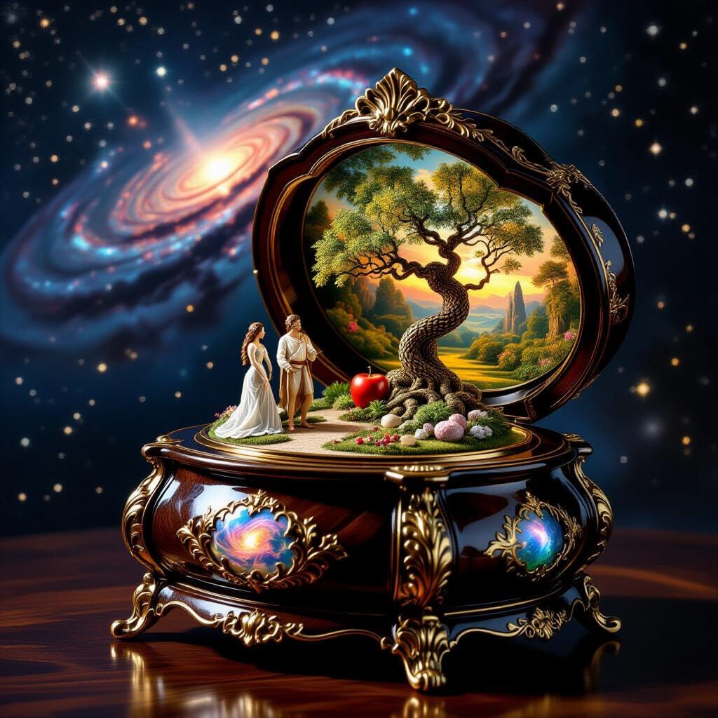 A striking picture of an antique music box opening to reveal a miniature Garden of Eden. The diorama features Adam and Eve with swirling nebulae in the style of a Renaissance painting.