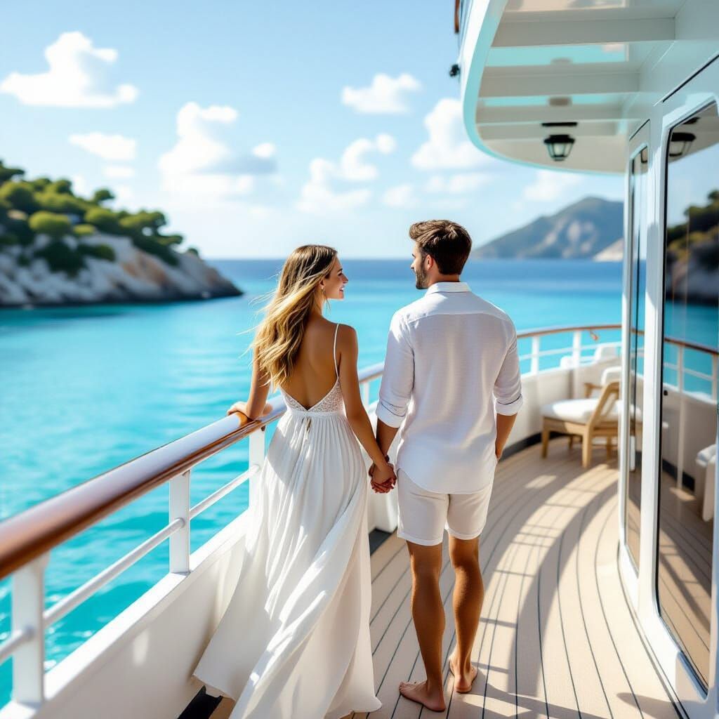 A couple enjoys a romantic moment on a luxury cruise ship deck, gazing at a serene turquoise bay under golden afternoon light. Photorealistic style.