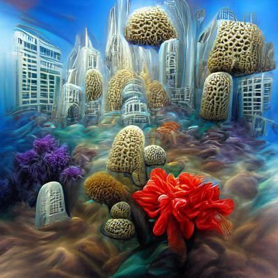 This image shows a vibrant coral city beneath the ocean's surface. The hyperrealistic rendering captures the intricate details of the coral and marine life.