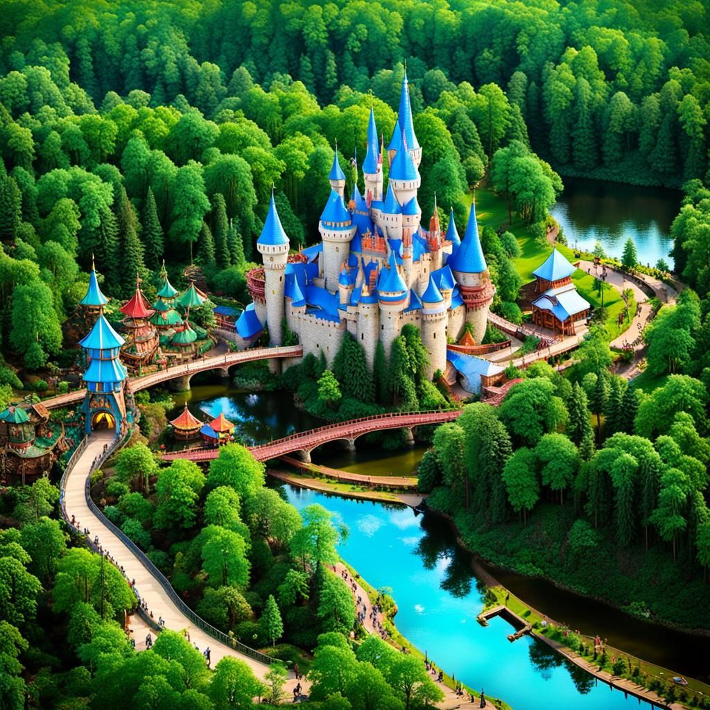 This image shows a fairytale theme park with castles and enchanted forests. The park features dragon coasters, boat rides, and fairytale characters, all rendered as 3D digital art.