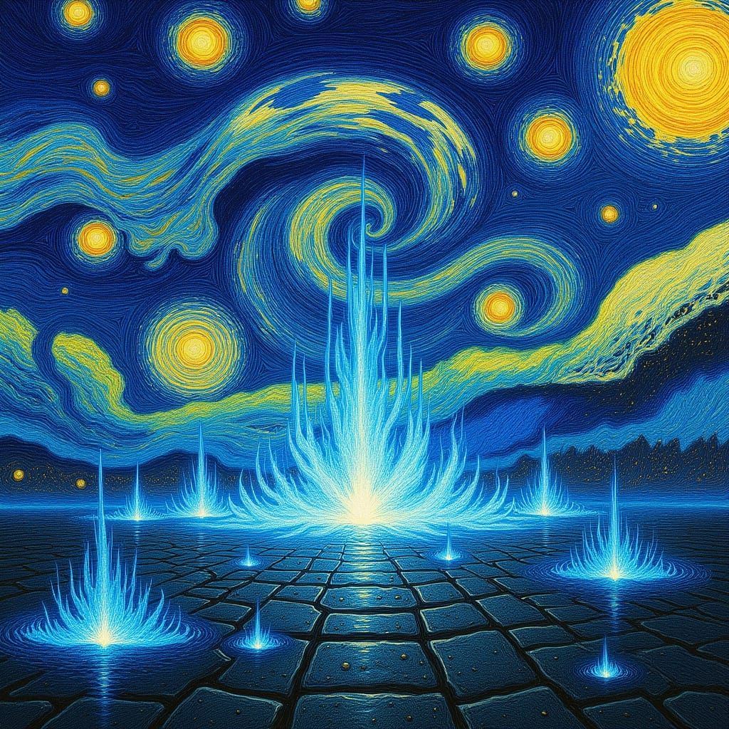Cybertron was waking, rendered in the style of Van Gogh's Starry Night, with swirling brushstrokes and vibrant colors that capture the energy and dynamism of the scene. From deep within the Well of All Sparks, great geysers and waves of supernatural energy rolled across Cybertron's metallic landscape. The energy exuded auroras of immense power, leaving behind veins of glittering blue energon and shimmering crystals in its wake.