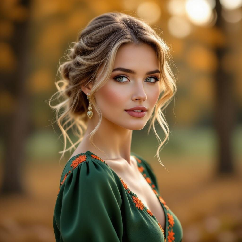 A serene woman with blonde hair in an elegant bun walks through an autumn forest. She wears a green dress with orange embroidery and a light jacket, bathed in soft light. Rendered with photorealistic detail.