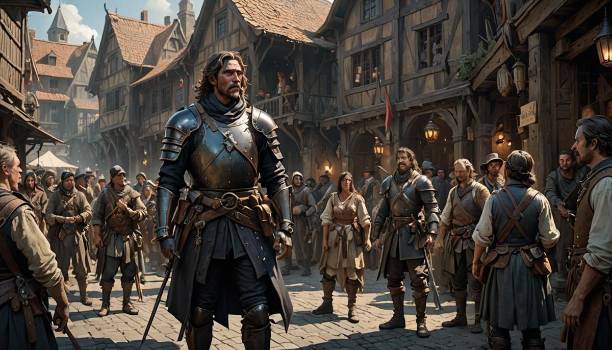 A dramatic dark fantasy scene of a 17th-century market town. Citizens with muskets gather before a hostelry, while women and children flee. Volumetric lighting and chiaroscuro create a mysterious atmosphere. As digital artwork in an Artstation style.
