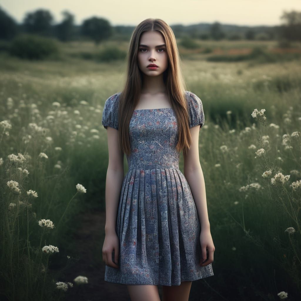 This image showcases a young woman posing in a vibrant meadow filled with flowers, her long hair flowing in the wind, as she wears a delicate mini dress with intricate details, captured in a hyperrealistic and cinematic style.