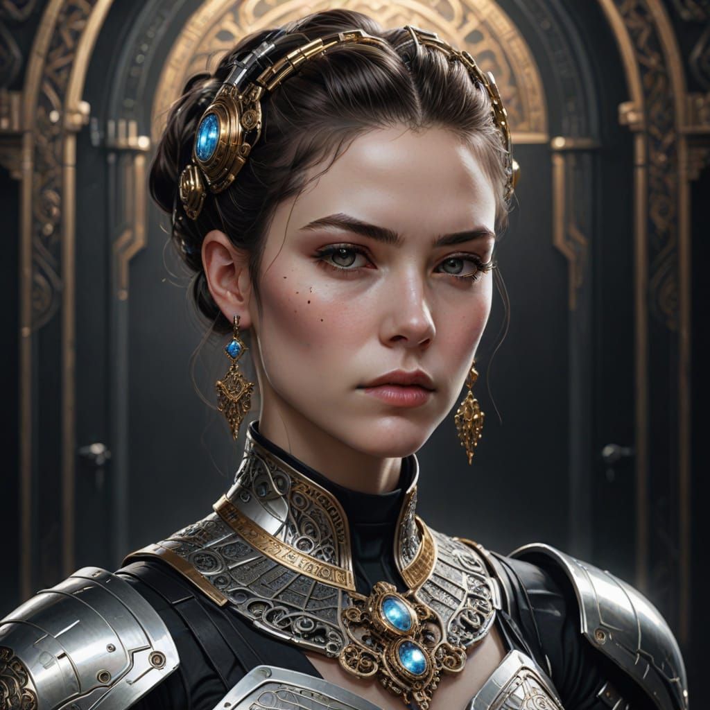 This stunning portrait shows a female cyborg with pale skin and dark hair, adorned in intricate silver armor and elegant jewelry, set against a detailed, arched frame background with golden accents, exuding a sense of sophistication and cybernetic elegance.