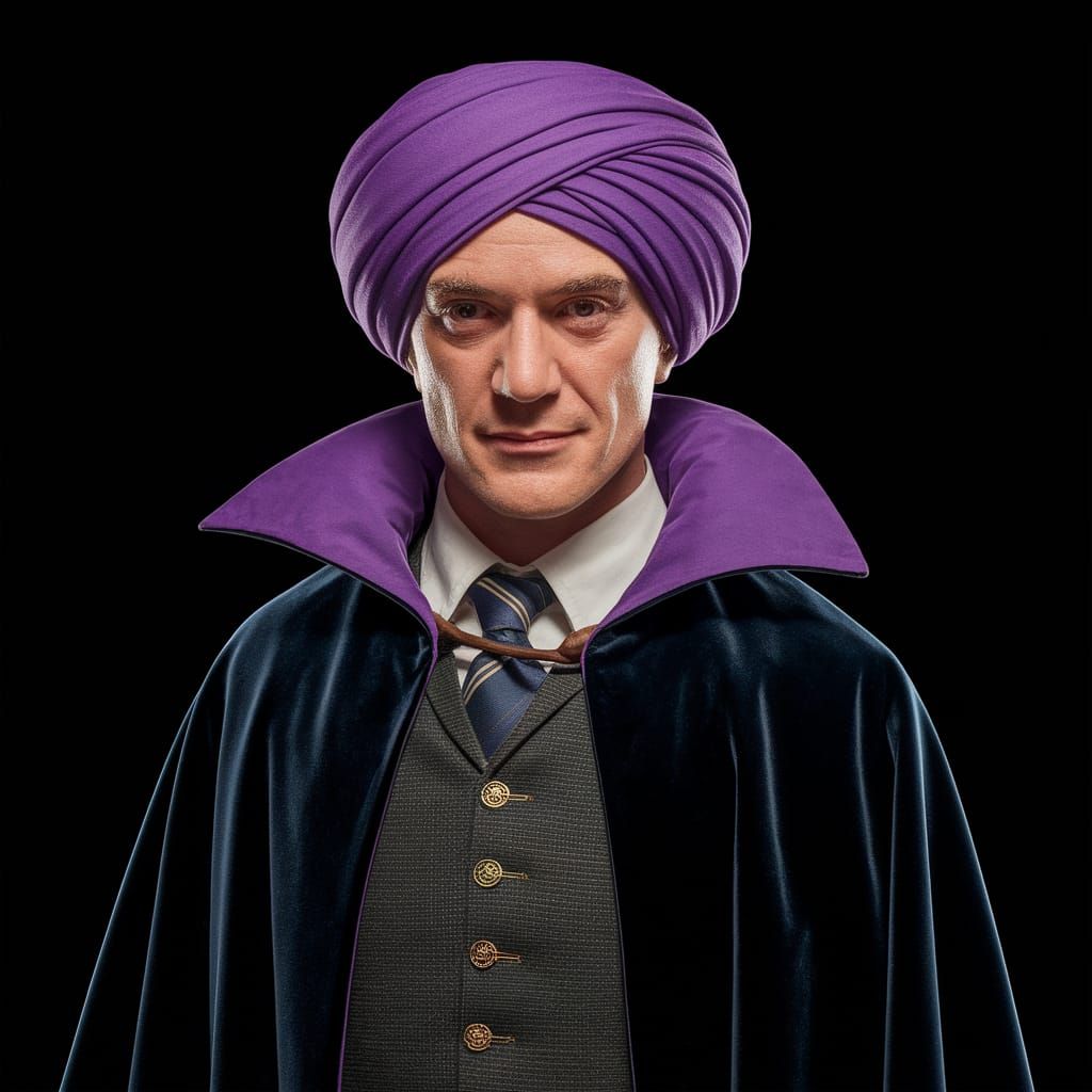 This image depicts Professor Quirrell dressed in a dark, renaissance-style robe with a purple lining and a distinctive purple turban.