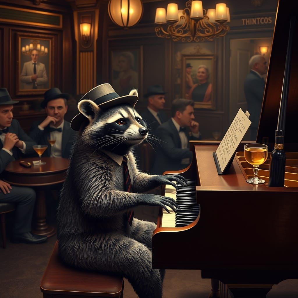 A captivating image of a raccoon in a fedora playing piano in a jazz club. Stylish animal patrons fill the club, enjoying cocktails in a vintage photograph style, with touches of surrealism.