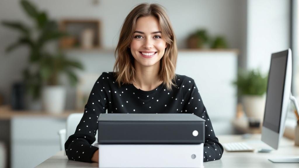 This image depicts a smiling young professional woman with hands resting on ring binders in an office. The neutral color palette and soft digital painting style create an inviting and professional portrait.