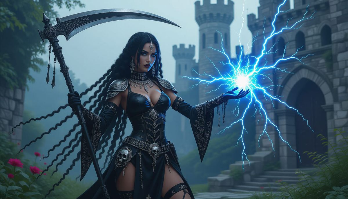 This image shows a dark sorceress in a diesel-punk style with gothic makeup. The sorceress is holding a scythe and casting electric blue lightning spells in a mystical garden near castle ruins. The art is in a dark industrial style.