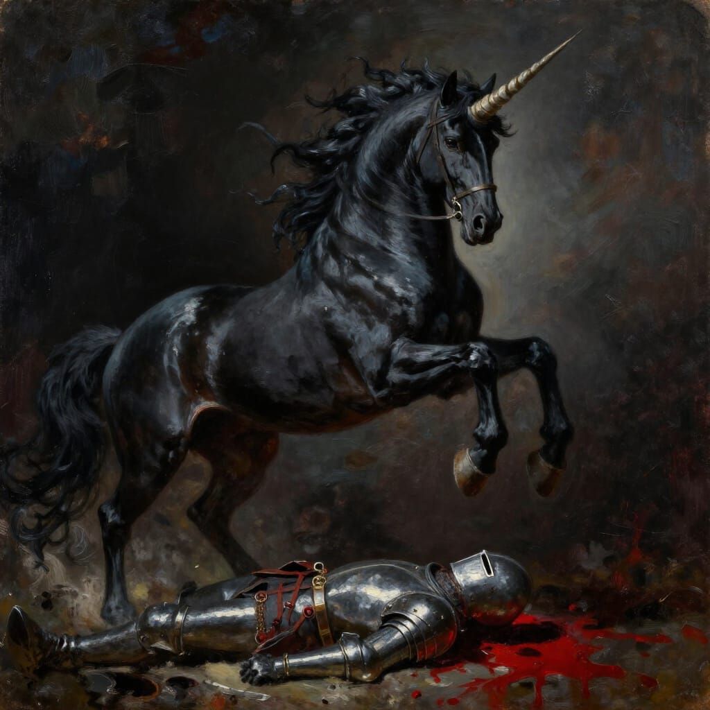 This image shows a black unicorn impaling a fallen knight, depicted in a dramatic, hyperrealistic oil painting style with rich impasto textures and chiaroscuro lighting.