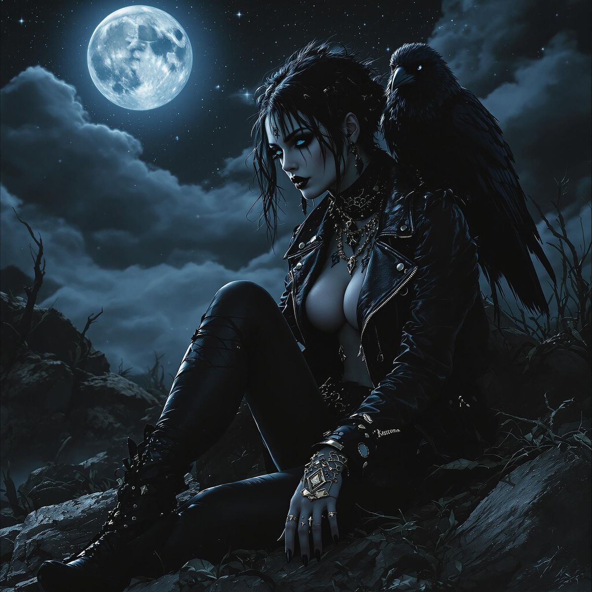 Photorealistic, gothic punk woman, tattoos covering arms and legs, black leather jacket , black choker, piercings, dark makeup, black hair, moon, and stars in the background, large, black crow, sitting pose, dramatic, lighting, detail, textures, fantasy, night scene, realistic style, intense expression, ...