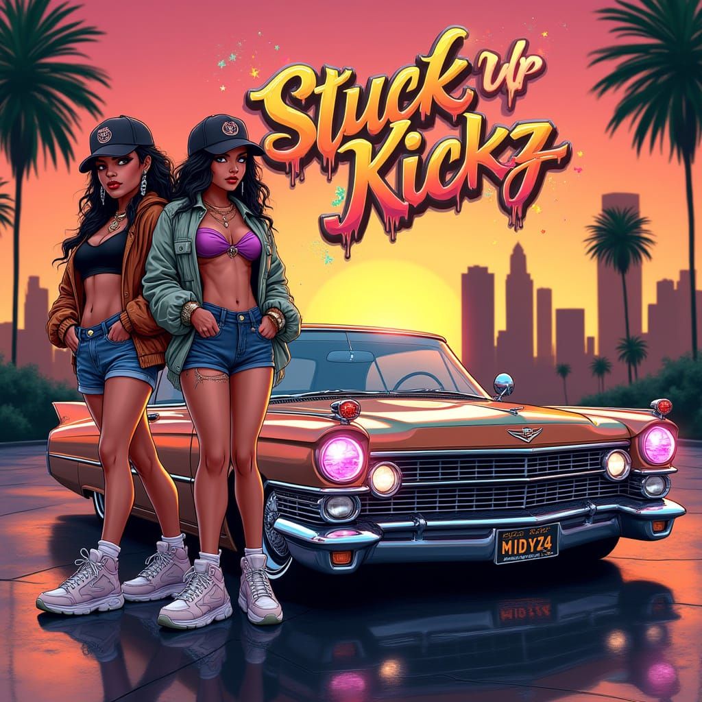 A vibrant anime-style graphic blending Texas hip-hop flair with Japanese flair, set against a warm Dallas sunset. Two confident women in bold streetwear outfits pose beside a customized Cadillac, amidst a luxurious Dallas cityscape.