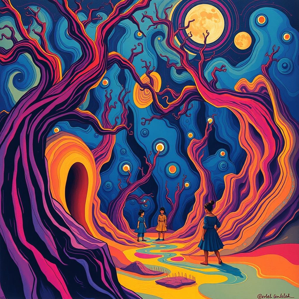 This vibrant, surreal image depicts a dreamlike scene with abstract, expressive brushstrokes and a woodcut aesthetic, blending complementary colors reminiscent of faience and majolica ceramics.