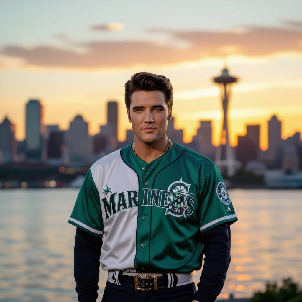 This image shows Elvis Presley wearing a Seattle Mariners jersey against a vibrant Seattle skyline. Photorealistic, cinematic lighting, and golden hour sunset details.