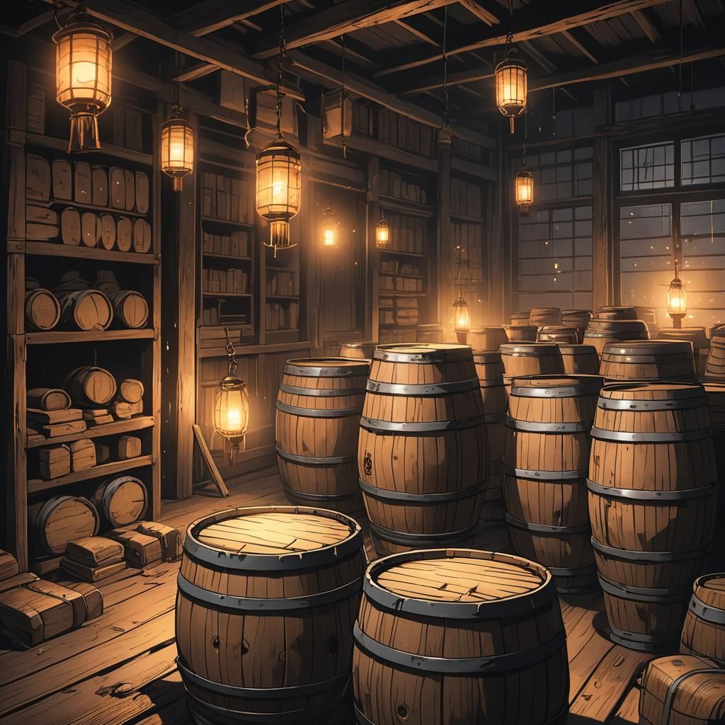 A vibrant anime image of a lost soul in a dimly lit room. The scene features amber and oak barrels, dramatic lighting and exaggerated proportions in a cel-shaded manga style.