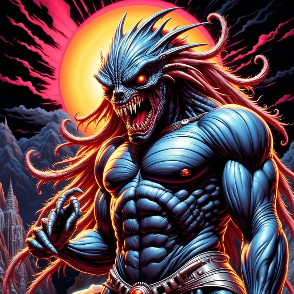 A monstrous figure strikes a provocative pinup pose, captured in a bold pulp comic aesthetic with vibrant neon colors and high-contrast lighting. This striking image features exaggerated features and dynamic linework.