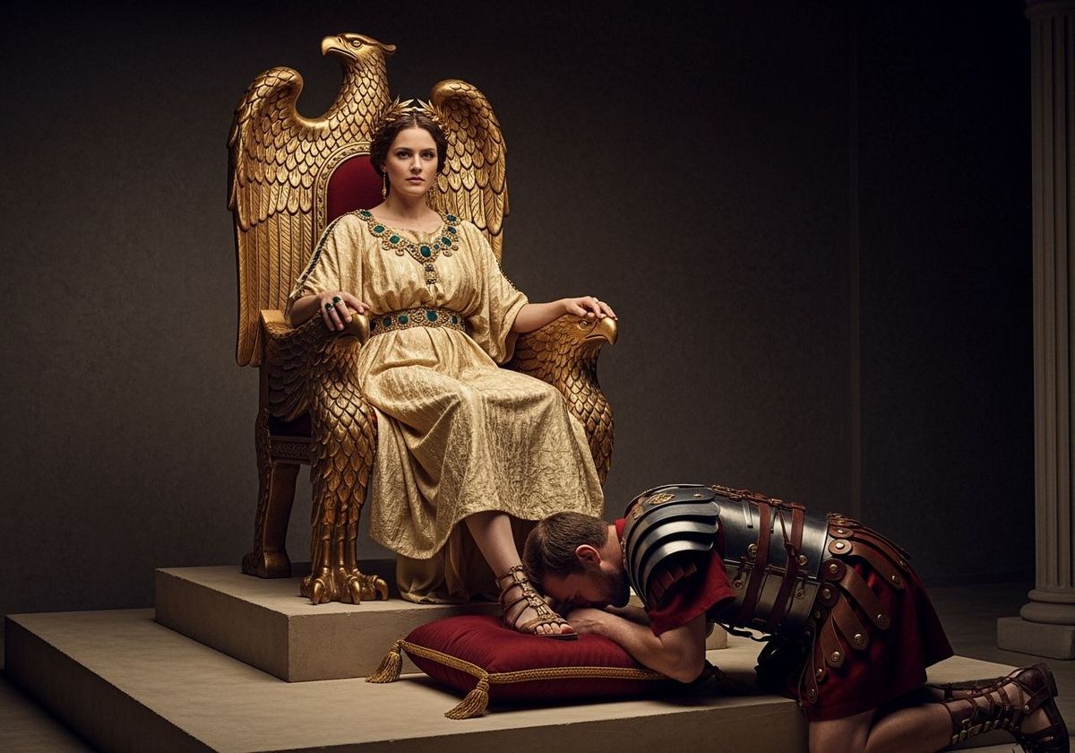 This image shows a Roman Empress seated on a golden throne, overlooking a legionnaire. She is adorned in a gold toga and wreath crown. The scene is depicted with sharp focus and natural lighting.