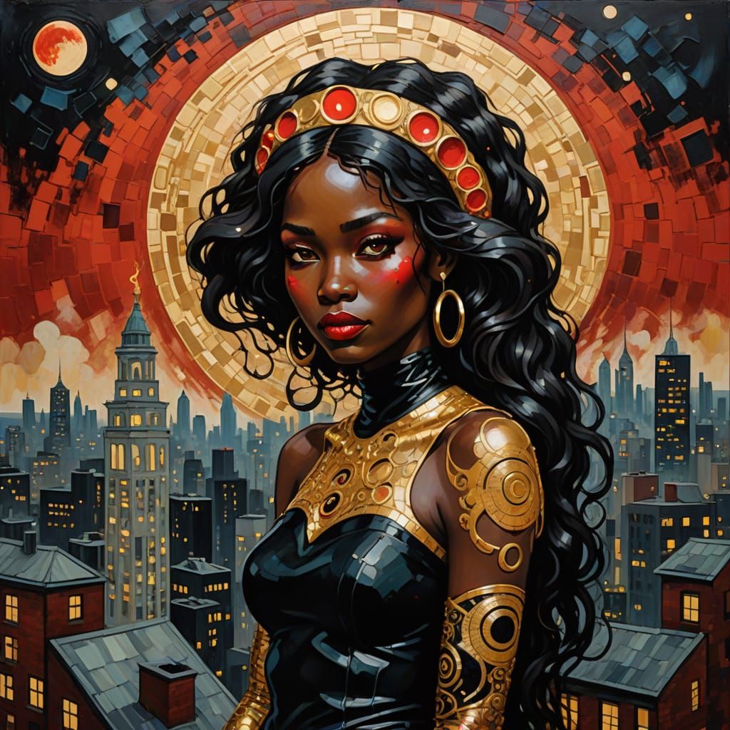 This abstract expressionist artwork features a unique black figure with eel-like features and a golden moon halo, leaning on a chimney atop a skyscraper, rendered with grunge oil colors on canvas.
