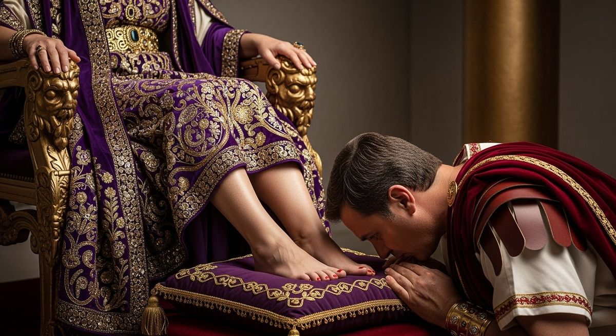 This image shows a Roman Empress seated on a golden throne as a senator kneels before her. The scene evokes the style of high-fashion portrait photography with soft focus and dramatic lighting.