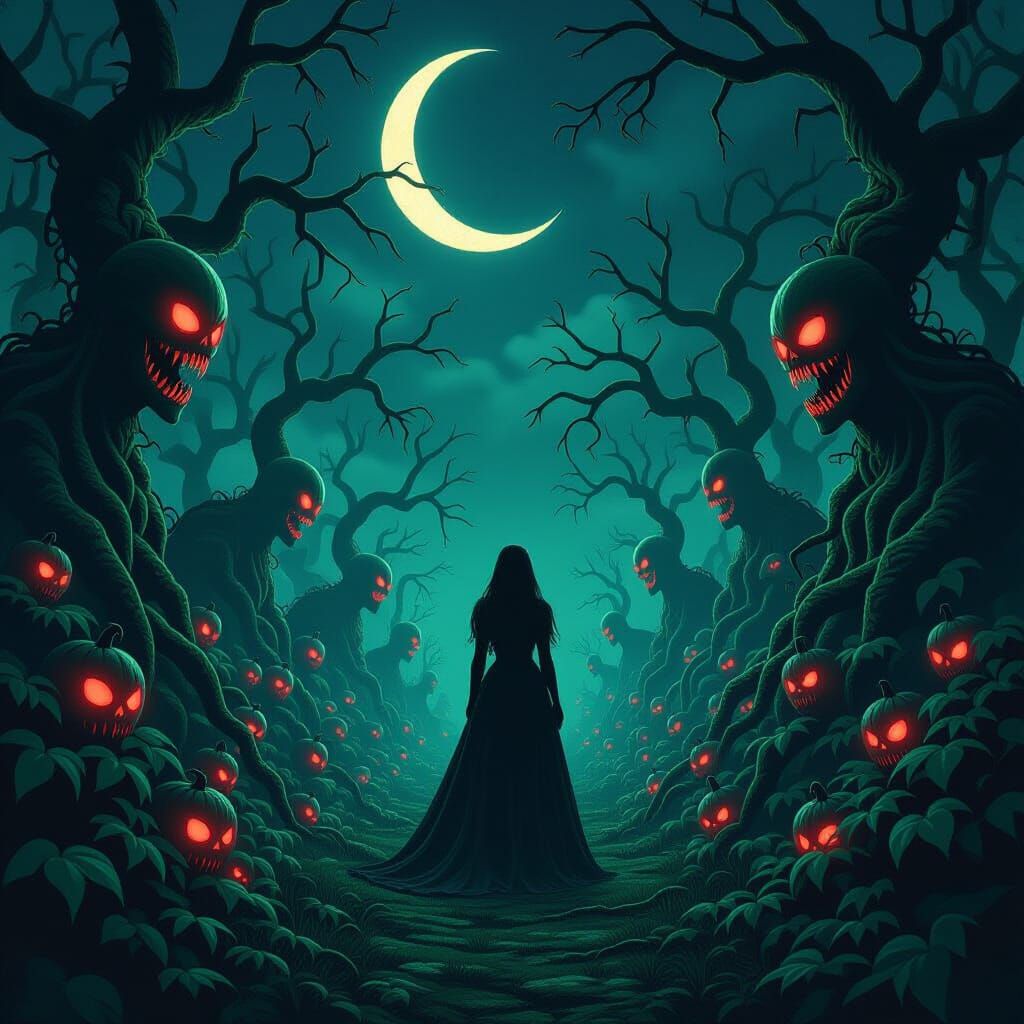 A chilling scene unfolds in a moonlit garden where menacing, red-eyed flowers lurk. Twisted trees and vine-entangled figures create an eerie ambiance in this gothic, surreal landscape.