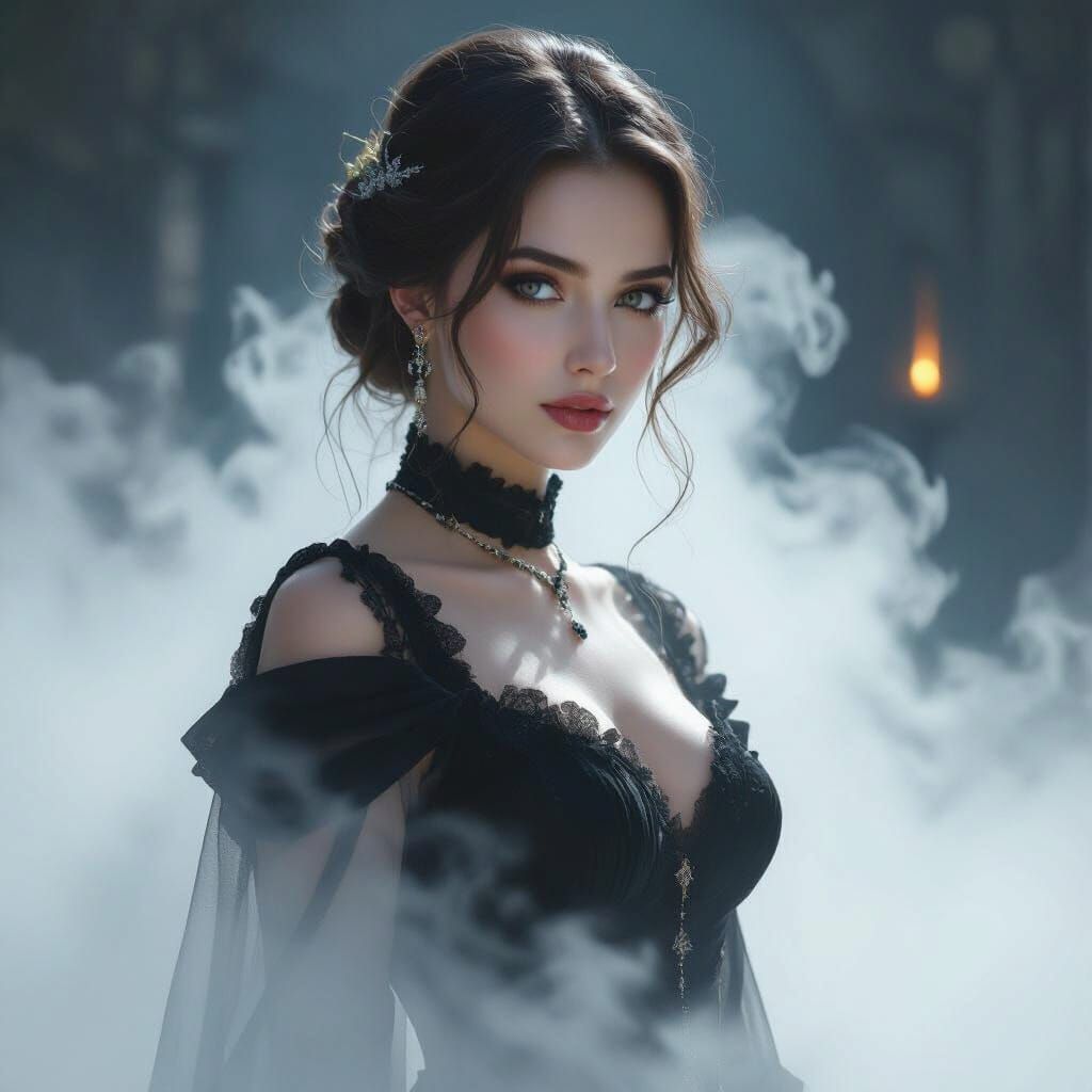 This image shows a beautiful young woman in elegant clothing, surrounded by mist. The artwork blends mystical and futuristic elements in a cinematic style.