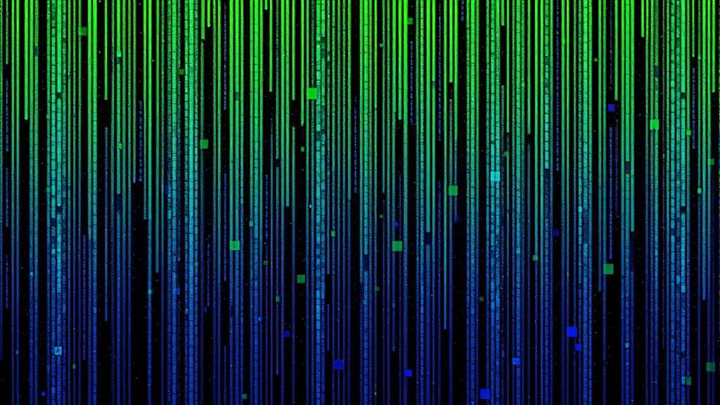 This image showcases a futuristic mosaic design with bold stripes and squares in shades of green, blue, and purple, evoking the mystery of the Cosmic Matrix.