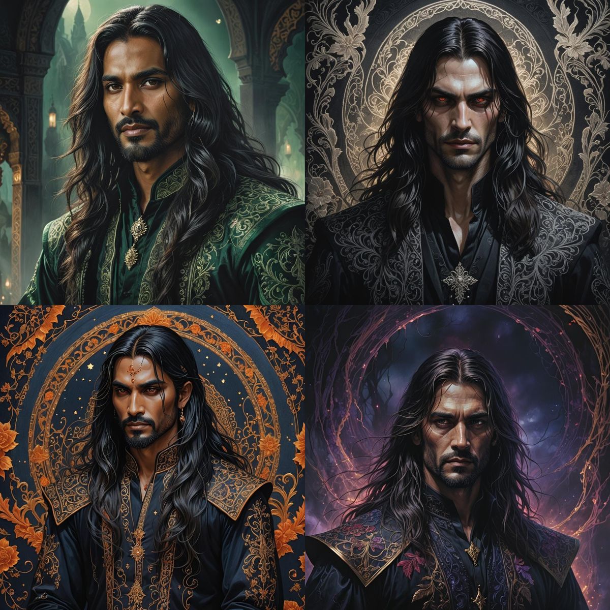 A striking picture of a South Asian man with long hair dressed in black embroidered attire. The image is a detailed matte painting with deep colors, intricate details, and a fantasy concept art style.