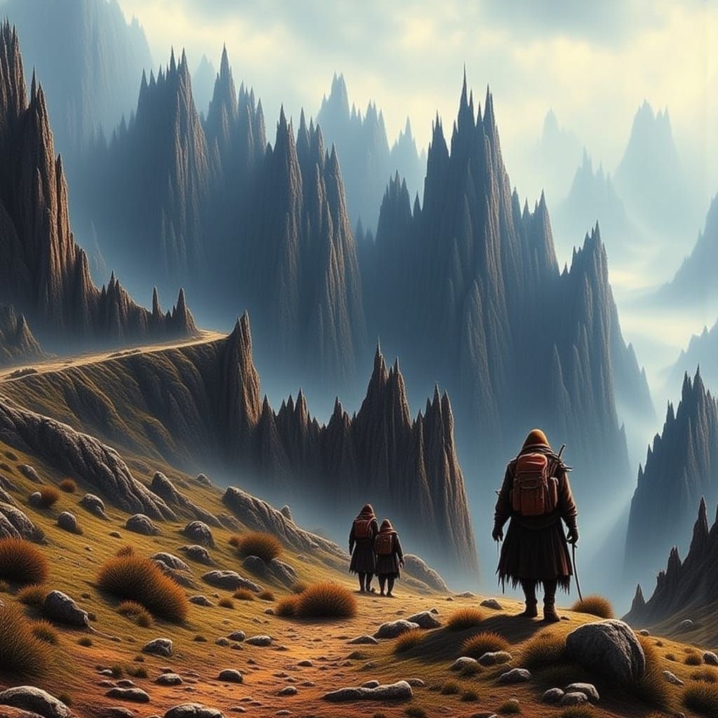 A dramatic image of travelers nearing a cliffside fortress amidst misty mountains. The fantasy scene features dramatic lighting, detailed industrial elements and atmospheric landscapes.