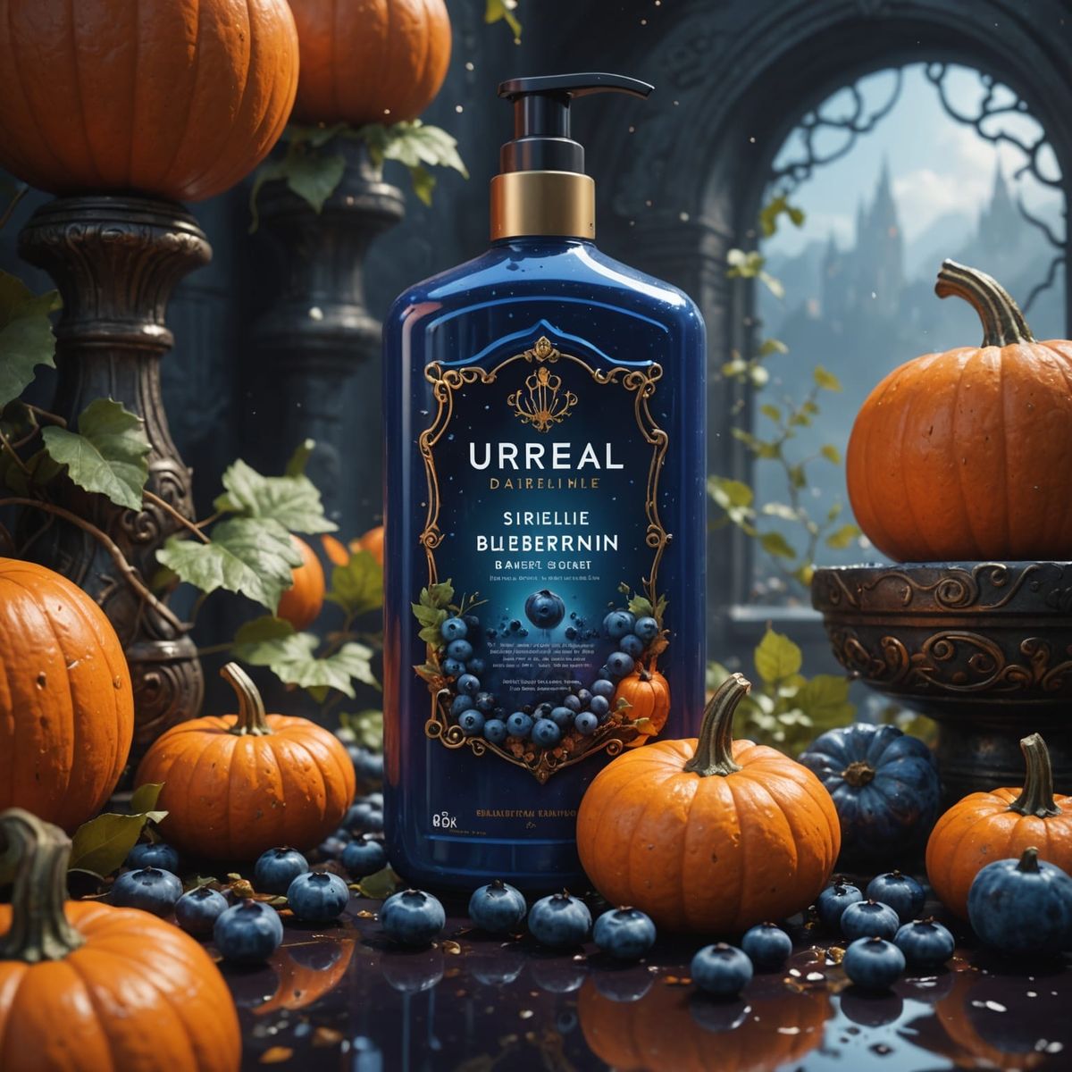 A stunning, detailed artwork of a body wash that combines the scents of blueberries and pumpkins, rendered in a vibrant, matte painting style with intricate fantasy elements and complementary colors.