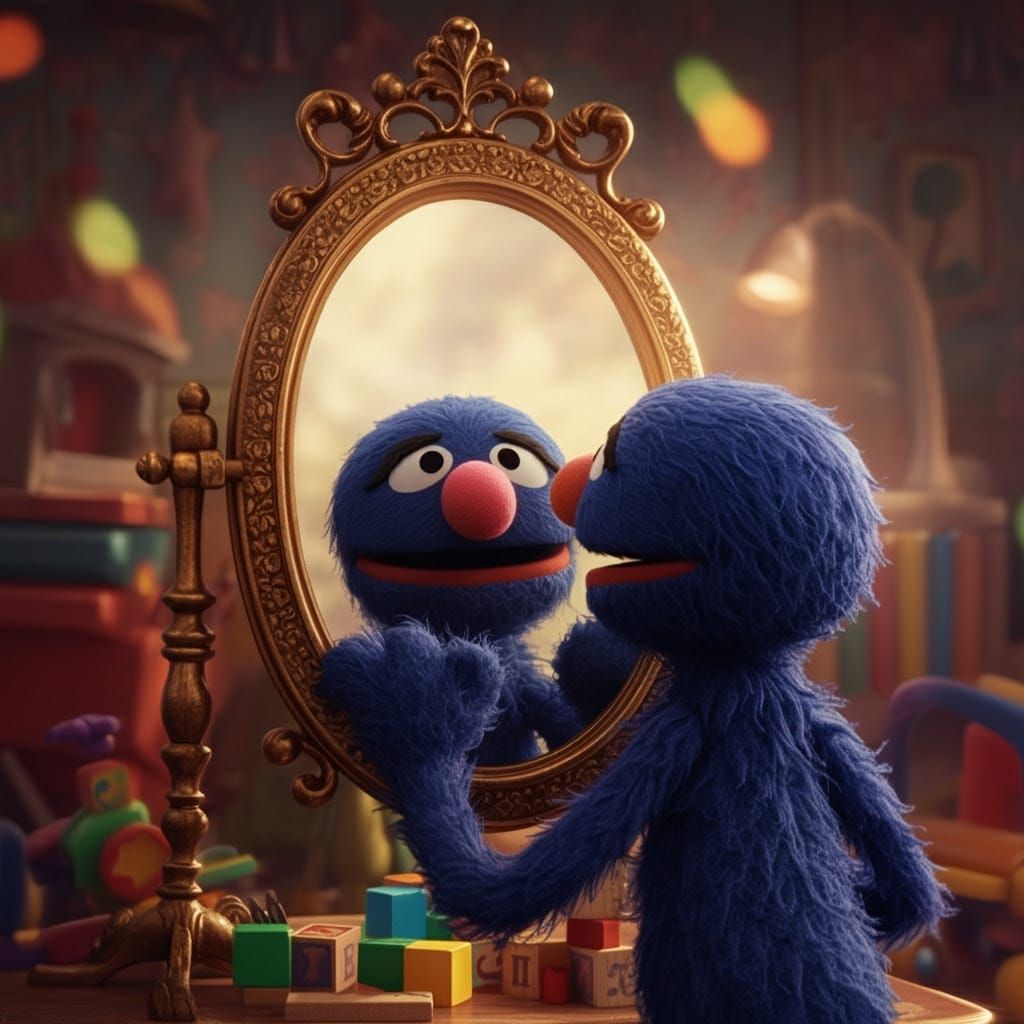This charming CGI portrait captures Grover's curious gaze in a warm, golden-lit playroom, surrounded by toys and colorful blocks. Rendered in stunning 20K resolution, the image showcases meticulous detail and vibrant colors, evoking a sense of nostalgia and wonder.