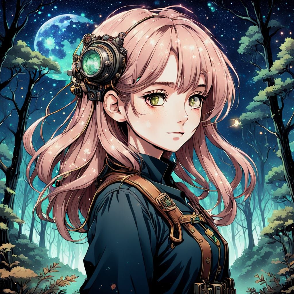 This image depicts a charming woodland scene under a starry sky, rendered in a detailed, hand-drawn 90s anime style, featuring a shy girl with blushing cheeks.