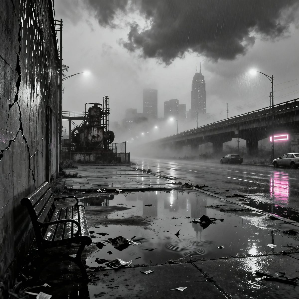 This image captures a foggy, deserted industrial park with rusted machinery and puddles, evoking a cinematic, eerie, and grayscale atmosphere.