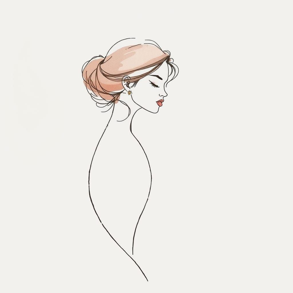 This image captures feminine beauty through minimalist one-line art. Delicate brush strokes blend sumi-e ink and watercolor in shades of amethyst and sand to portray the essence of elegance.