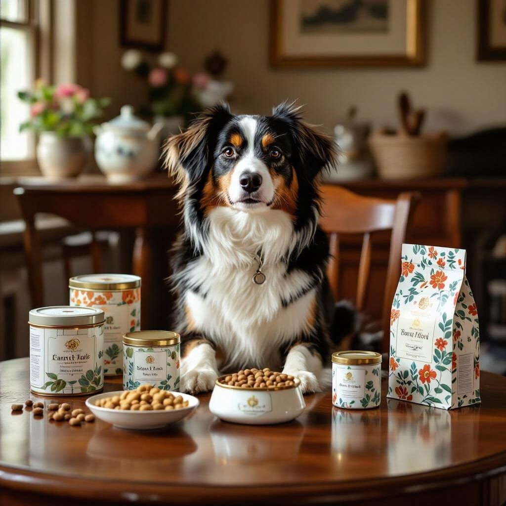 A charming image of an elegant dog at a polished table, surrounded by dog food and care items. The artwork blends Beatrix Potter's details with modern simplicity in soft colors.
