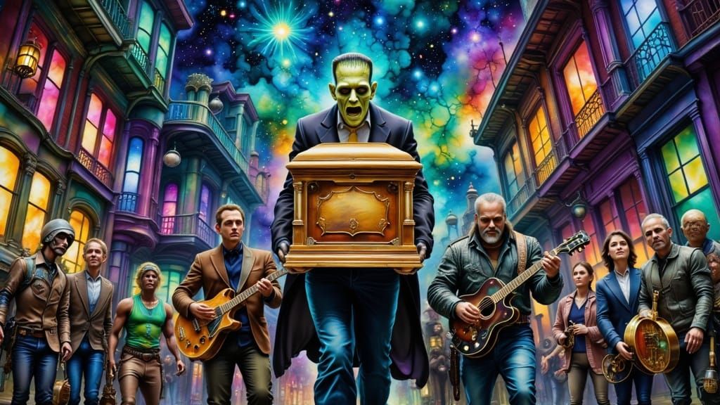 <lora:PR AlcoholWCGlass:1.0> <lora:hyperkraximalismus:1.0> <lora:Akimora:1.0> <lora:Fantasy Ink Flux:1.0> <lora:Ink Poet:1.0> A Frankenstein-like monster's casket carried by mournful Universal Monsters, including Dracula, Wolfman, and Mummy, amidst a lively New Orleans-style Jazz Funeral parade in the ...