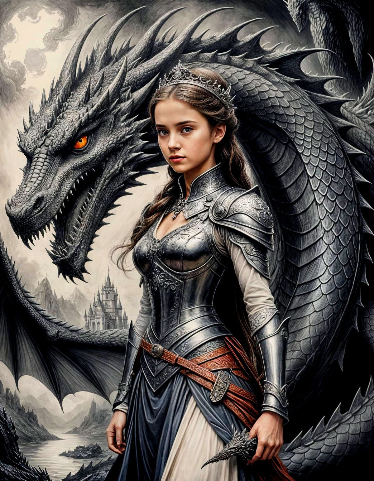 This image is a stunning charcoal drawing of a beautiful princess being safeguarded by a powerful dragon, showcasing intricate details and a sense of awe-inspiring protection.