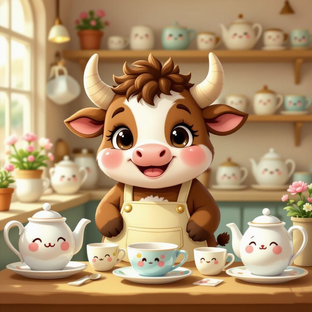 This image features a cheerful, anthropomorphic cartoon bull in an apron, surrounded by friendly, expressive chinaware. The scene is set in a cozy shop with soft, pastel lighting and whimsical details, inspired by Japanese kawaii art styles.