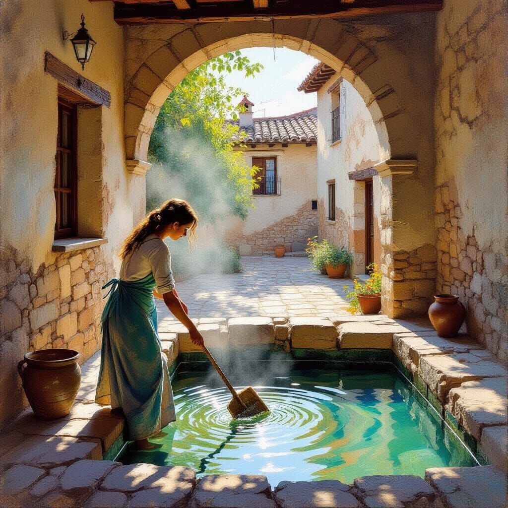 This image depicts a young woman washing clothes in a historic village washhouse during the golden hour. Soft earth tones and blues dominate, with visible brushstrokes creating a sense of movement and light.