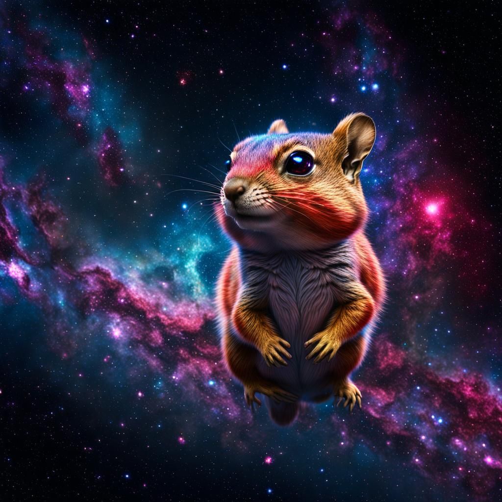 A hyper-detailed image of a chipmunk floating in a cosmos of rubies, stars and nebulae. The image is rendered with cinematic lighting and particle effects in Unreal Engine 5.