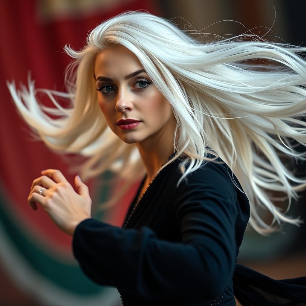 This image shows a woman with long white hair dancing in elegant black attire. The close-up portrait captures a professional photography style with vibrant colors, intense gazes, and a storytelling aesthetic.