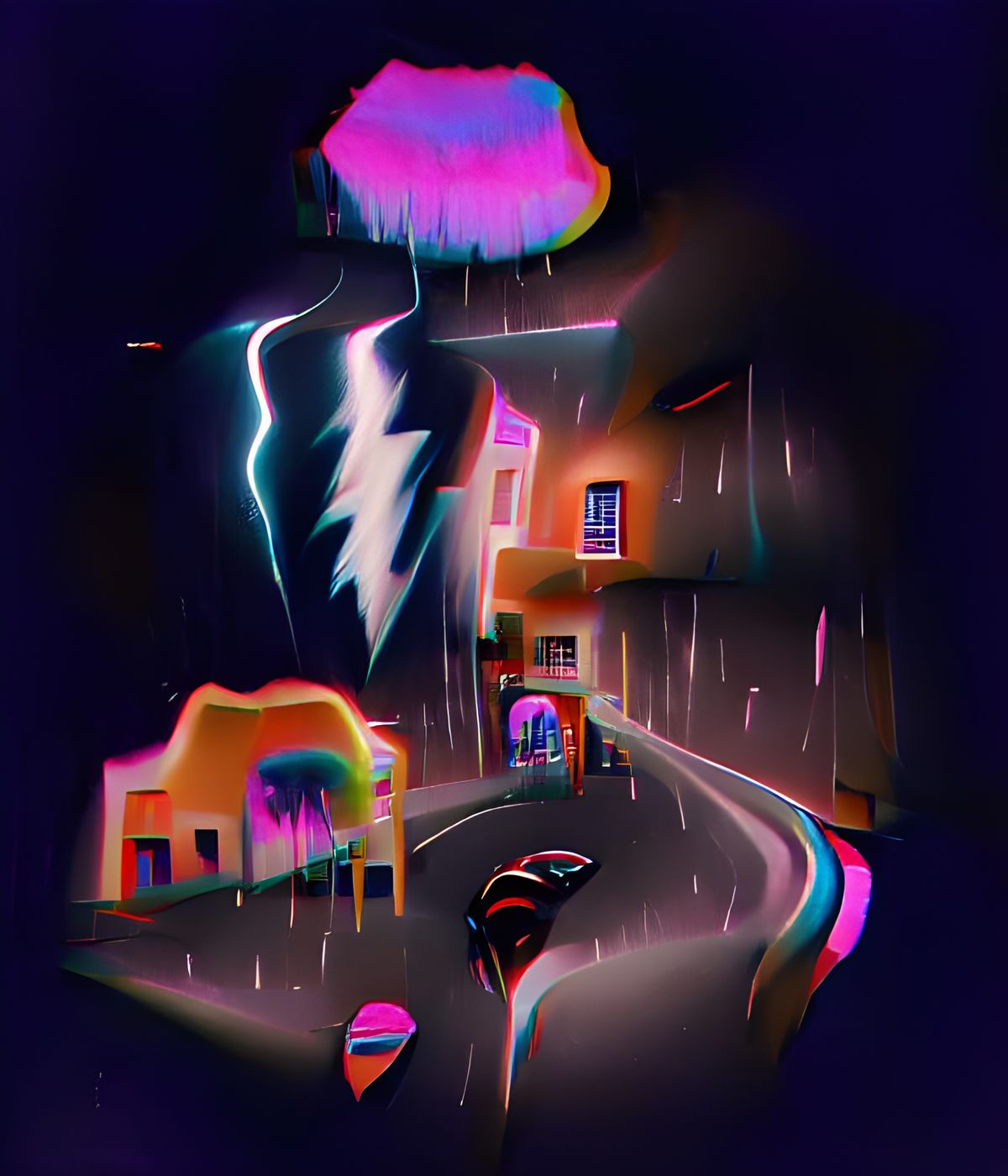 A vivid image of a thunderstorm over an empty street, rendered in a neon psychedelic style. The artwork captures a surreal and romantic atmosphere.