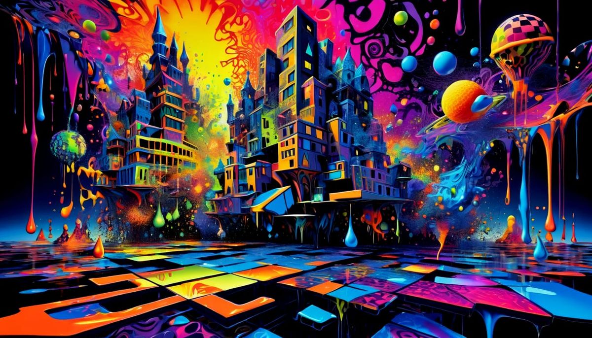 "Dripping in liquid Cubist Urban Explosion scintillating abstruse zentangle psychedelic UV Blacklight 3D"
