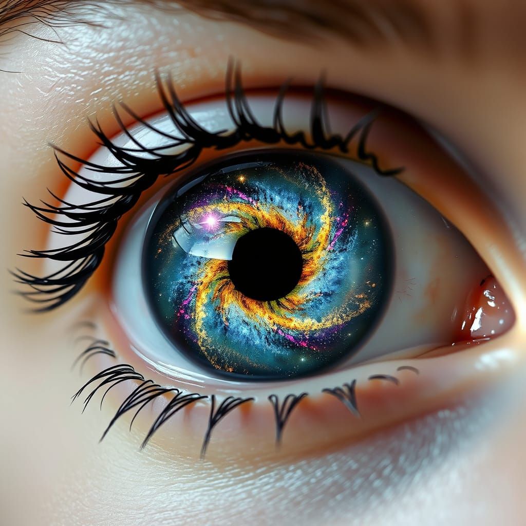 This image features a hyper-realistic human eye. The iris is a vibrant, multi-colored galaxy with a black hole pupil, surrounded by detailed eyelashes, rendered in a style reminiscent of sci-fi and fantasy art.