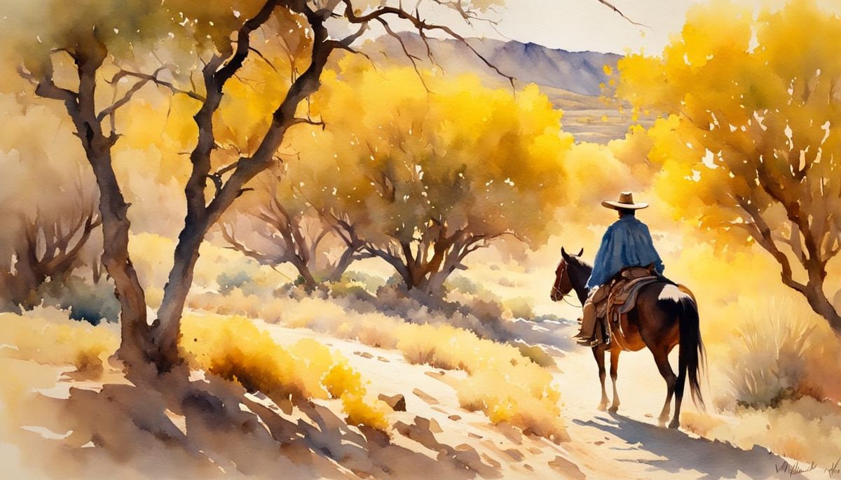 A watercolor painting of a lone vaquero on horseback traversing a landscape of rolling yellow hills dotted with walnut trees. The artwork evokes a muted, impressionistic style.