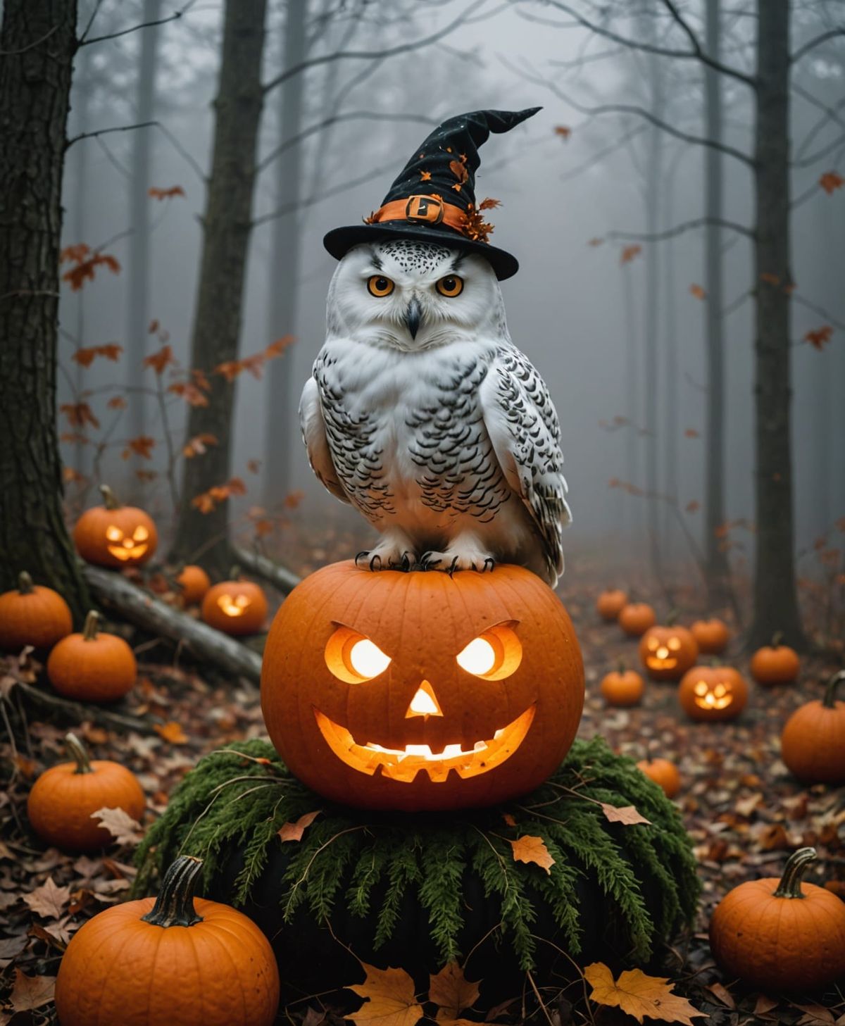 This image shows a snowy owl wearing a pumpkin hat, perched on a glowing jack-o'-lantern in a misty woodland setting. The atmosphere is slightly eerie and autumnal.