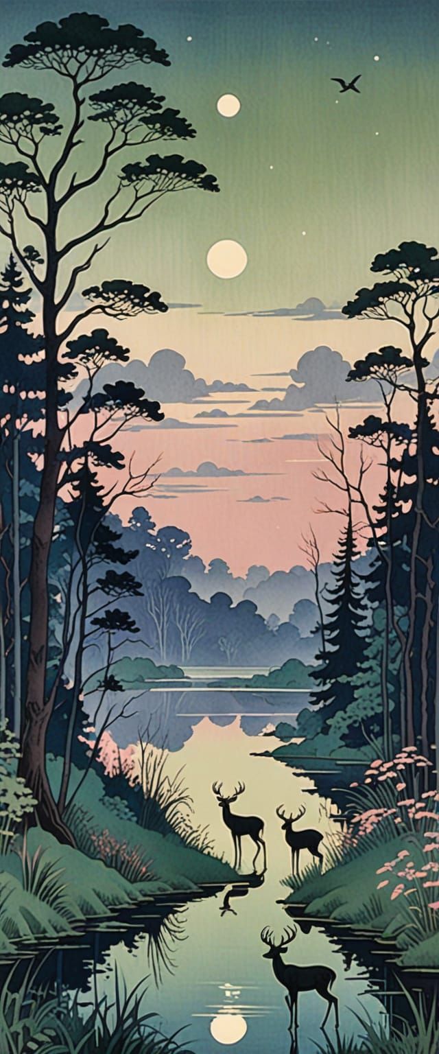 A serene image of a flower field with deer and herons by a pond. Rendered in a naive folk art style with dreamy colors, reminiscent of a 1920's lithograph.